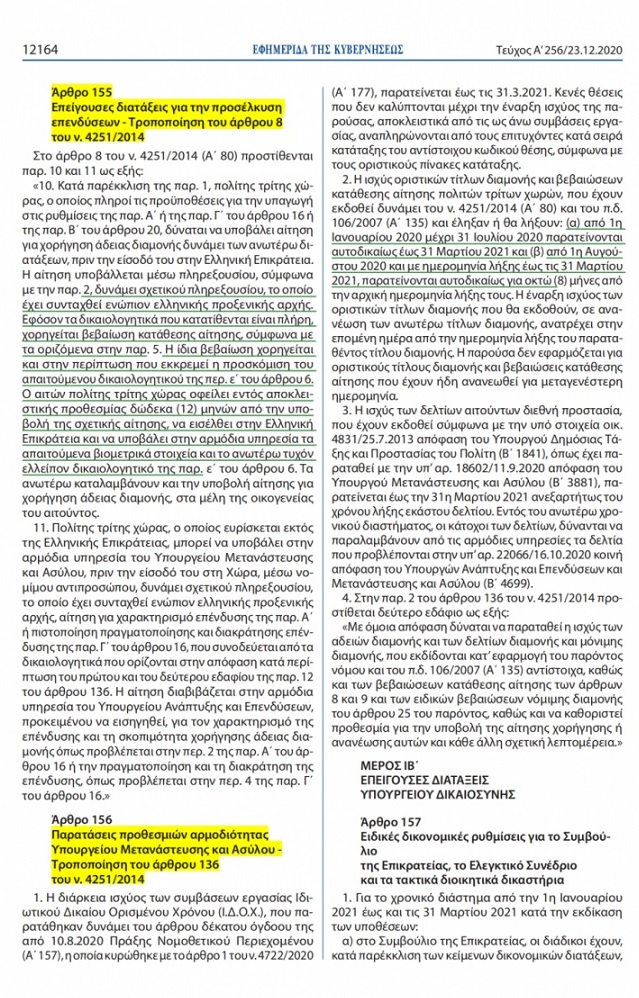 Điều 155-156 của dự luật mới là nội dung sửa đổi các điều khoản trong Luật L.4251/2014 về “thủ tục xin cấp phép thẻ thường trú nhân cho nhà đầu tư và thành viên trong gia đình”.